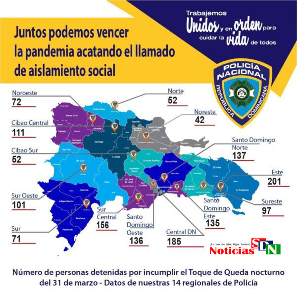 En las zonas donde más personas no acataron el toque de queda fueron en La Romana (200), Distrito Nacional (185), Bani (156), Santo Domingo Norte y Oeste con más de (130).