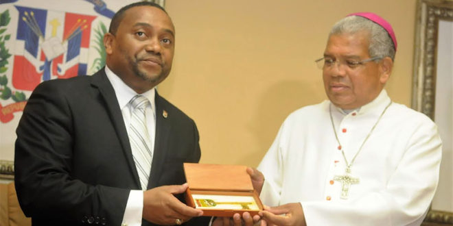 Santo Domingo Norte.-El alcalde René Polanco entregó la llave de la ciudad al arzobispo metropolitano de Santo Domingo, monseñor Francisco Ozoria Acosta quien giró una visita de cortesía la Alcaldía de Santo Domingo Norte.