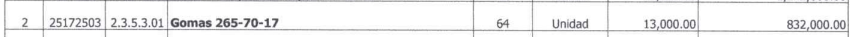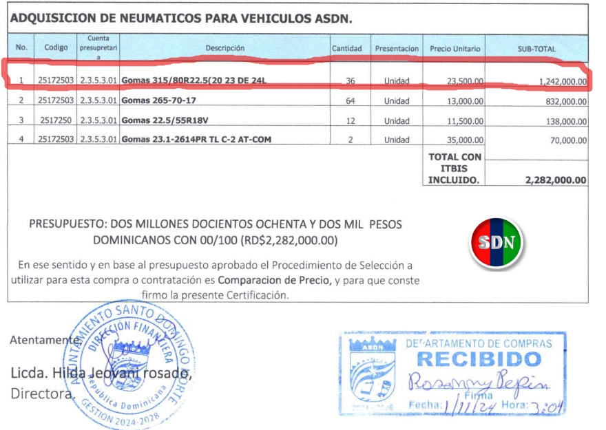 En el mismo pedido, se encuentran unas 64 Gomas 265-70-17 las cuales aparecen con un precio estimado según la Alcaldía de RD 13,000.00 pesos por unidad, lo que arroja un monto de RD832,000.00 pesos, en esta parte si estuvo exacto el cálculo de parte del Departamento Financiero del ASDN.![]()