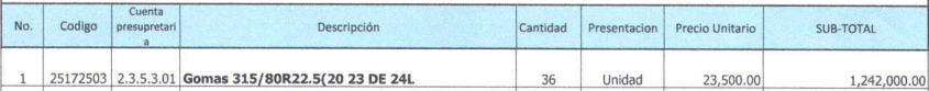 Dentro del paquete, se encuentran cotizada las Gomas 315/80R22.5 (20 23 de 24L) con un precio estimado de RD 23, 500.00 la unidad, de éstas, el ASDN necesitaría unas 36 unidades, lo que sumado arroja un total de RD 846,000 pesos, sin embargo, en el cálculo presentado por el Departamento de Financiero, el total fue de RD 1,242,000.00, es decir, hay una diferencia de RD 396,000.00.