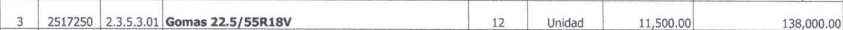 La tercera casilla presenta 12 unidades de Gomas 22.5/55R18V con un precio unitario de RD 11,500.00, para un total de RD 138,000.00, aquí no hubo problemas de diferencias.