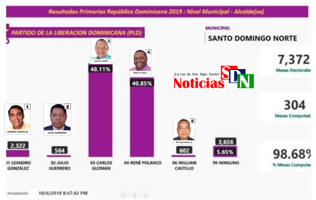 Así lo muestra una captura de pantalla a la que Noticias SDN ha tenido acceso, en donde Guzmán supera por 8.11% a su compañero de partido y contrincante en las primarias, el alcalde René Polanco.