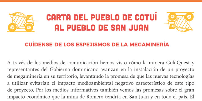 A través de los medios de comunicación hemos visto cómo la minera GoldQuest y representantes del Gobierno dominicano avanzan en la instalación de un proyecto de megaminería en su territorio, levantando la promesa de que las nuevas tecnologías a utilizar evitarían el impacto medioambiental negativo característico de este tipo de proyecto. Por los medios informativos también vemos las promesas sobre el gran impacto económico que la mina de Romero tendría en San Juan y en todo el país. El contrato, según el ministerio de Energía y Minas, sería sumamente ventajoso para el Estado dominicano.