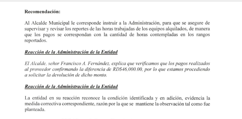 Santo Domingo Norte. – Según la auditoría realizada por la Cámara de Cuentas de la República Dominicana (CCRD) a la gestión del exalcalde Francisco Fernández, hasta en el alquiler de pala mecánica hubo irregularidades, en donde se pagan más horas de las trabajadas.