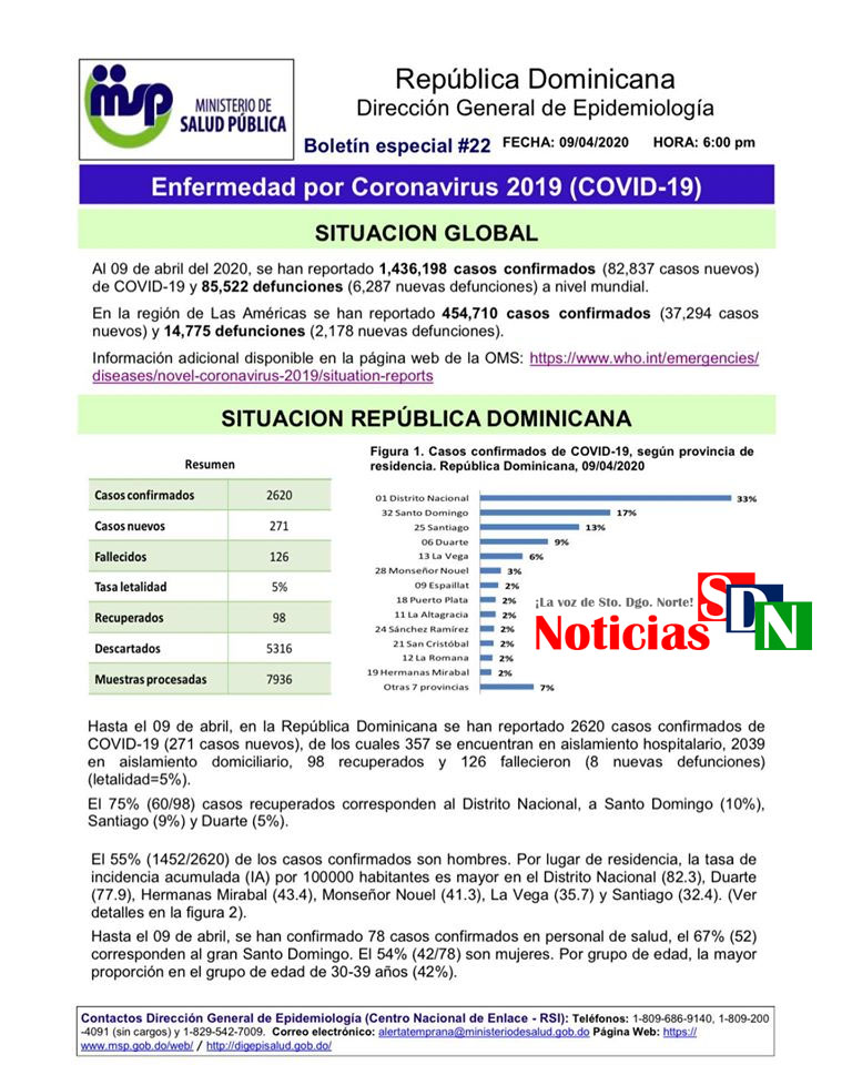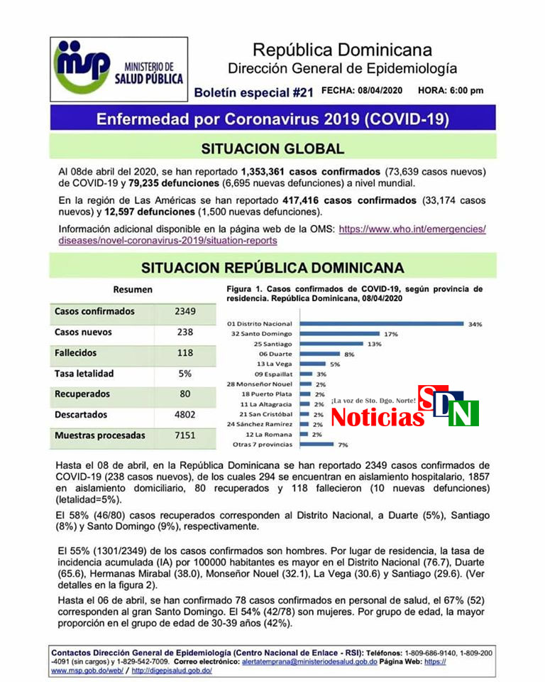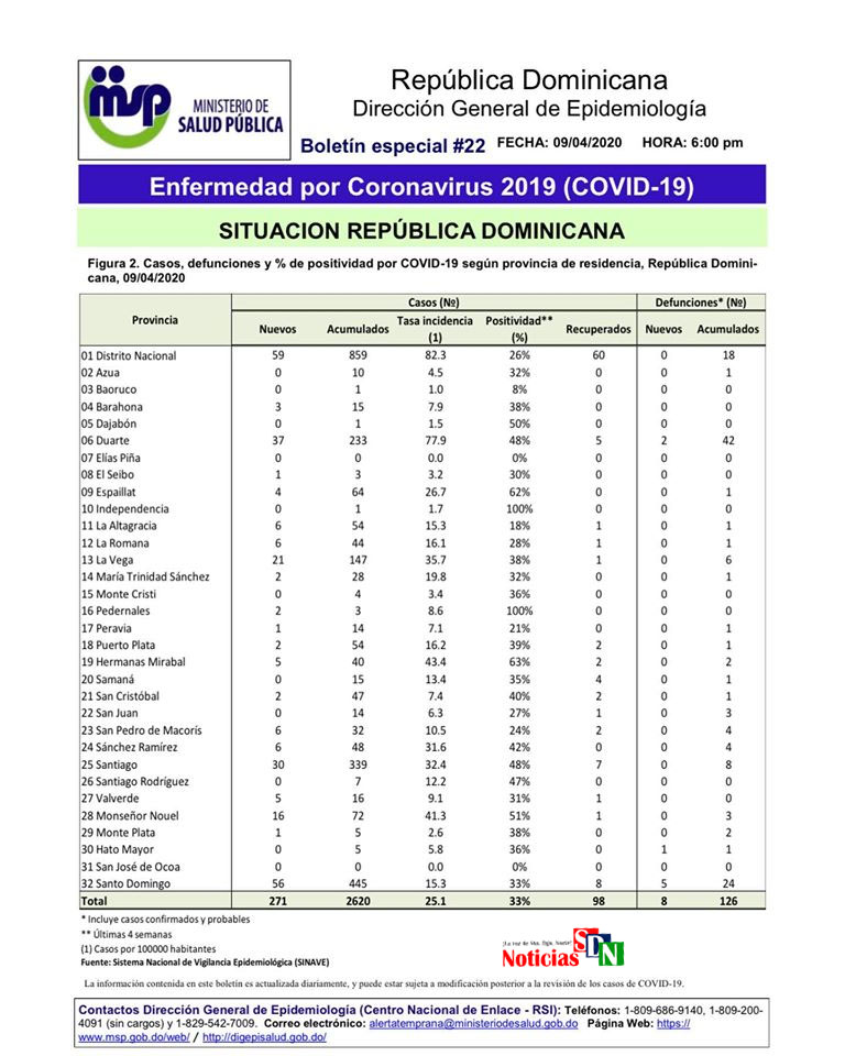 Se mantienen como provincias con mayor cantidad de contagiados el Distrito Nacional, Santo Domingo, Santiago y Duarte.