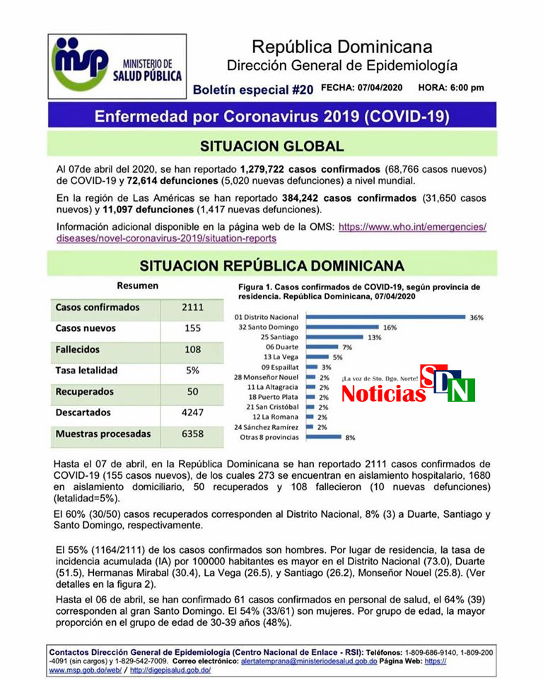 Santo Domingo. – Continúan elevándose los infectados por coronavirus (COVID-19) en la República Dominicana, según registra el Ministerio de Salud Pública (MSP) en su boletín número 20.