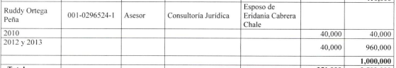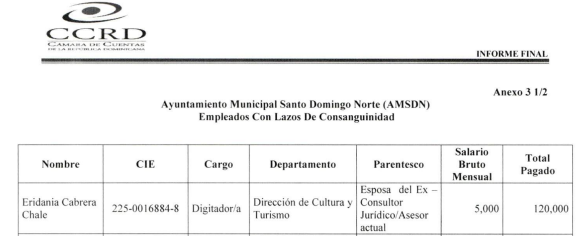Mientras que Ruddy Ortega Peña y Eridania Cabrera Chale, siendo esposos ambos laboraban en el Ayuntamiento de Santo Domingo Norte (ASDN), él como Asesor en la Consultoría Jurídica cobrando RD$ 40 mil pesos, y ella, RD$ 5 mil pesos como digitadora en la Dirección de Cultura y Turismo.