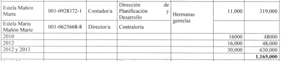 Aunque casi con el mismo nombre, una trabajaba en la Dirección de Planificación y Desarrollo, Estela Mañón Marte devengando RD$ 11 mil pesos, mientras que su hermana Estela María Mañón Marte, era nada más y nada menos que la directora de Contraloría, cobrando entre RD$16 mil pesos y RD$ 30 mil pesos.