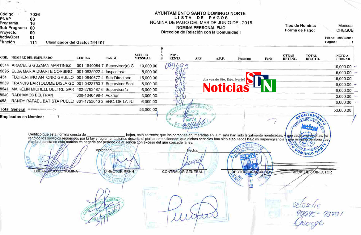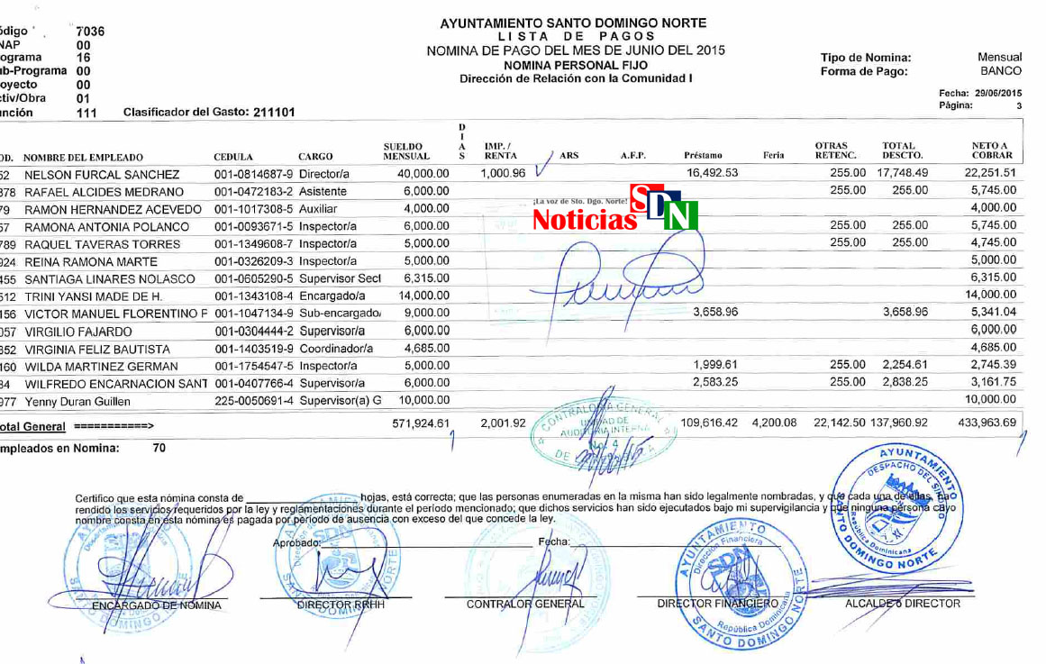 Nómina del Ayuntamiento de SDN en el mes de Junio del 2015, gestión de Francisco Fernández con Gabino Hernández como director de Relación con la Comunicad.