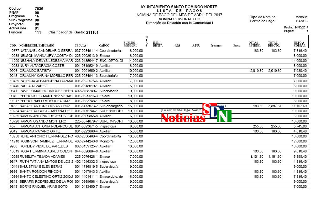 Nómina del Ayuntamiento del mes de Abril de estaño 2017, con René Polanco como alcalde y Milagros Ortega como directora de Relación con la Comunidad.