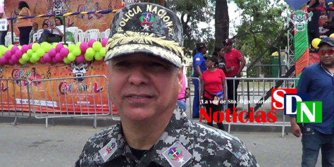 Santo Domingo Norte. – El Director Regional de la Policía Nacional en Santo Domingo Norte, general Mario Objío Morales, estaca la seguridad del Carnaval 2019, durante el calentamiento de esta actividad.
