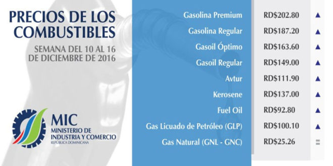 El galón de avtur se venderá a RD$111.90, aumenta RD$4.00; el kerosene a RD$137.00 galón, con un alza de RD$5.00; el fuel oil costará RD$92.80 por galón, con incremento de RD$5.00 y el Gas Licuado de Petróleo (GLP) se venderá a RD$100.10 por galón, para un alza de RD$5.00.