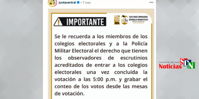 Santo Domingo Norte. – La Junta Central Electoral (JCE) le ha recordado a los miembros de los Colegios Electorales y a la Policía Militar Electoral, que los Observadores de Escrutinios que estén acreditados, pueden ingresar a los colegios electorales una vez culminado el horario hábil para votar, y que estos, pueden grabar el conteo de los votos.