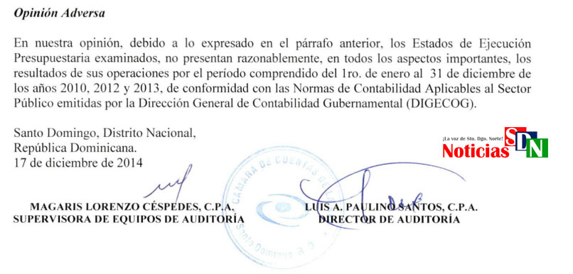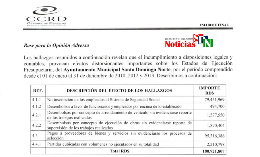 Santo Domingo Norte. – La Cámara de Cuentas de la República Dominicana (CCRD), en su auditoria realizada en al Ayuntamiento de Santo Domingo Norte (ASDN), referente a los años 2010, 2012 y 2013, detalló las irregularidades que existieron con relación a más de 180 millones de pesos.