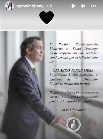 Santo Domingo Norte. – El sorpresivo asesinato del ministro de Medio Ambiente y Recursos Naturales, Orlando Jorge Mera, ha consternado a miles de dominicanos, incluyendo a sus compañeros del Partido Revolucionario Moderno (PRM) en este municipio, quienes han ofrecido sus condolencias a través de sus redes sociales.