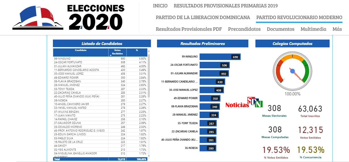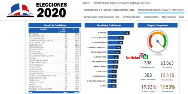 Santo Domingo Norte. – La Junta Central Electoral (JCE). ha emitido los datos preliminares de las primarias celebradas para elegir los candidatos de los dos partidos involucrados en las primarias del 2019, en donde el Partido Revolucionario Moderno (PRM) ya tiene definido quienes serán los cantidatos que le estarán representanto en las elecciones de 2020.