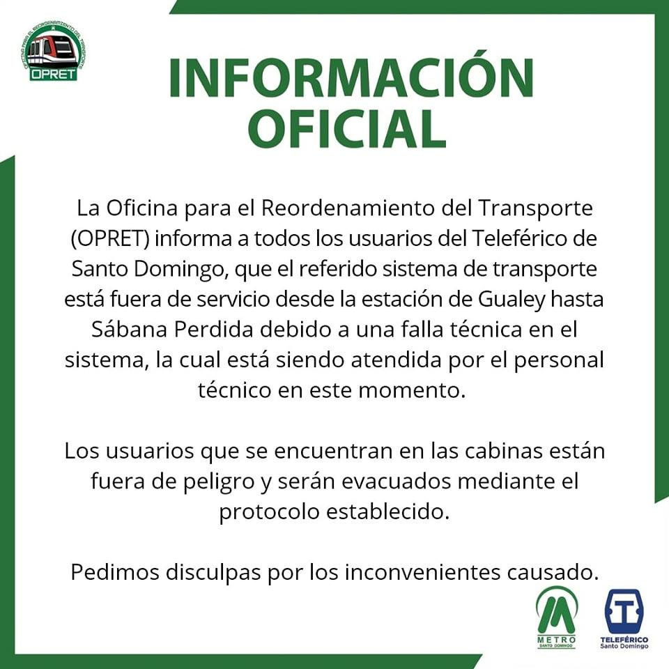 Santo Domingo Norte. – El Teleférico de Santo Domingo presentó una «falla técnica» por lo que se vieron precisados a suspender los servicios del medio de transporte al menos en tres de sus cuatro estaciones.