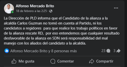 Recordó que algunos cercanos a la dirigente peledeístas como es el caso del Secretario General del PLD en SDN Alfonso Mercado, hicieron publicaciones en las redes anticipándose a la derrota que tendría el candidato de la Alianza Opositora Rescate RD, Carlos Guzmán, quien solo obtuvo 57, 174 votos a su favor, para un 43.49%.